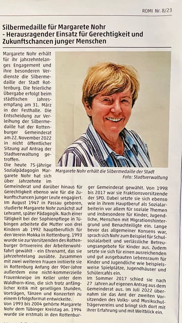 Unsere Vorständin Margarete Nohr erhält bei der Bürgerehrung 2023 eine Medaille in Silber. Ihr herausragendes Engagement für Kinder und Jugendliche und ihre langjährige politische Arbeit zum Wohl der großen und kleinen Rottenburger*innen wurde geehrt .